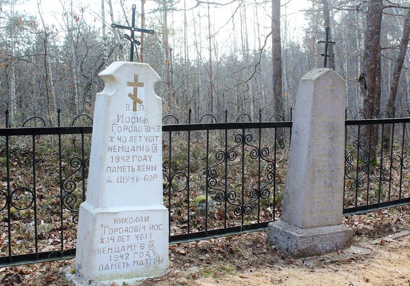 Месца масавага пахавання, якое ўключае 2 участкі, на якіх устаноўлены 3 помніка. Пахаваны 9 чалавек: у 1942 г. – Бобрык Рыгор Лукіч, Гарадовіч Васіль Дзем’янавіч, Гарадовіч Іосіф, Гарадовіч Мікалай Іосіфавіч, Гарадовіч Мікалай Рыгоравіч, Гарадовіч Рыгор Мікалаевіч, брат Гарадовіча Мікалая, Русак Сяргей, у пасляваенны час – Гарадовіч Вальга Платонаўна.