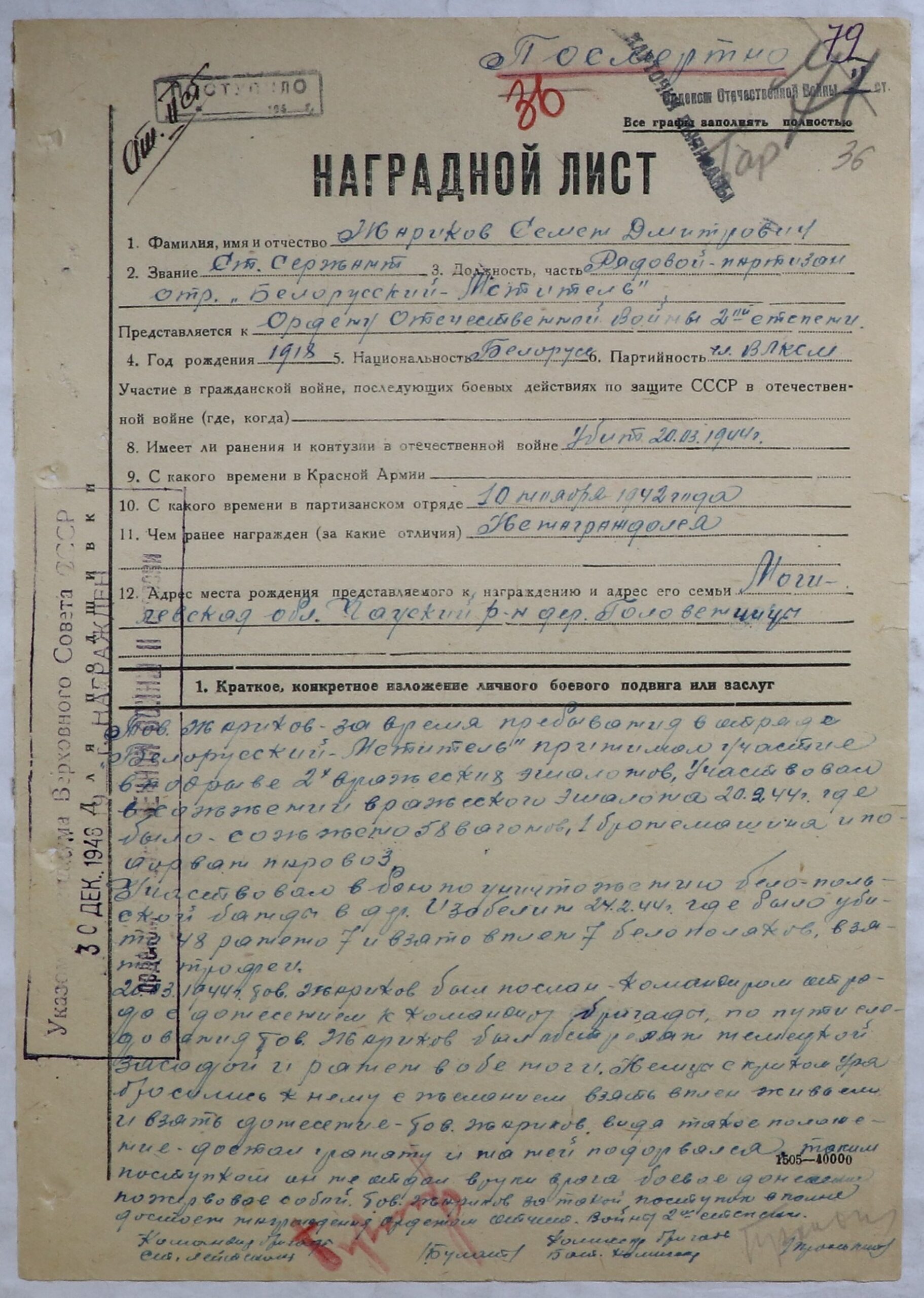Узнагароджаны: Указам Прэзідыума Вярхоўнага Савета СССР ад 30 снежня 1948 года Жарыкаў Сямён Дзмітрыевіч пасмяротна быў узнагароджаны ордэнам Айчыннай вайны II ступені.