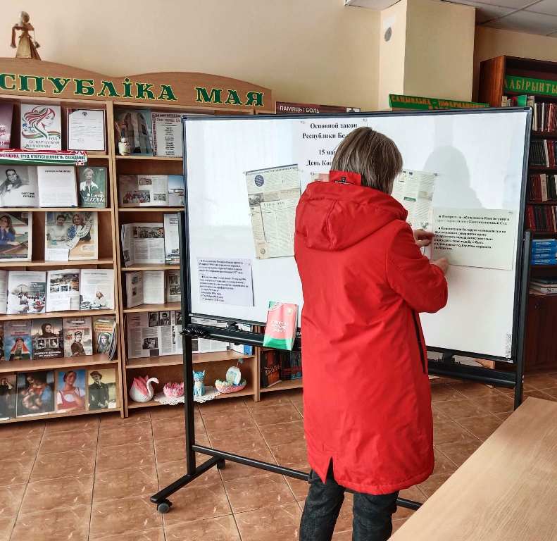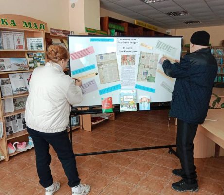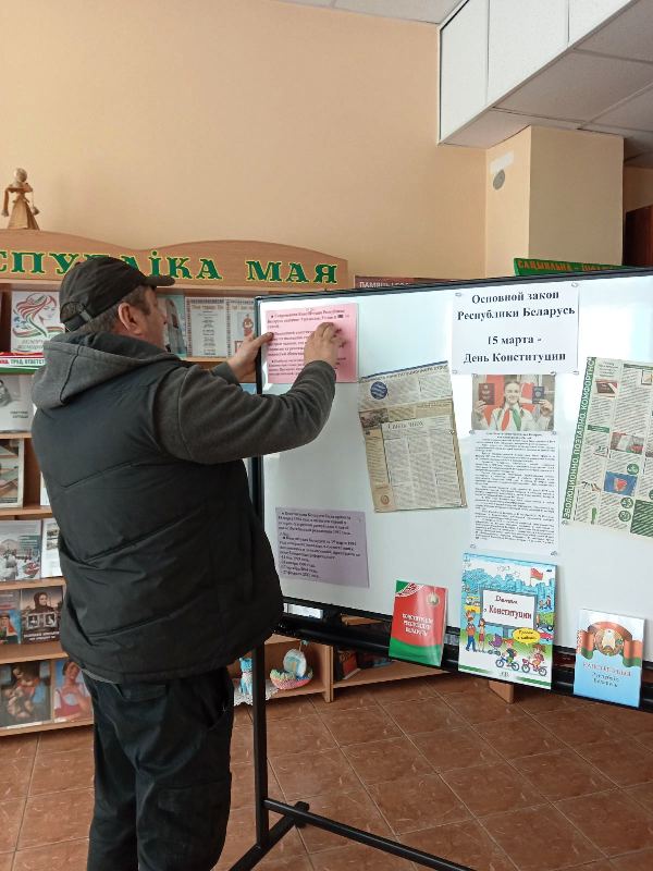 В Юратишковской библиотеке посетители приняли участие в составлении информационного квилта «Основной закон Республики Беларусь», размещая на нём листочки с ответами на вопрос: «Что я знаю о Конституции нашей страны?». В результате получилось наглядное полотно, которое последовательно раскрывает историю и значимость Основного Закона.