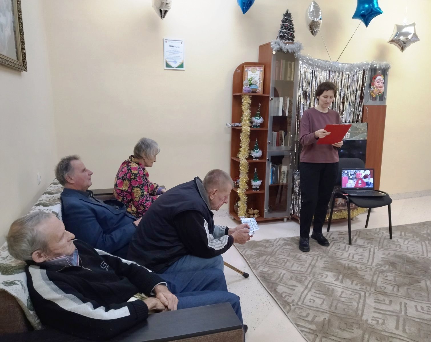 Для собравшихся был организован душевный праздник под названием «Новый год к нам идёт» Мероприятие прошло в уютной, почти семейной атмосфере. Библиотекарь подготовила праздничную программу с добрыми стихами, песнями, загадками и викторинами на новогоднюю тематику.